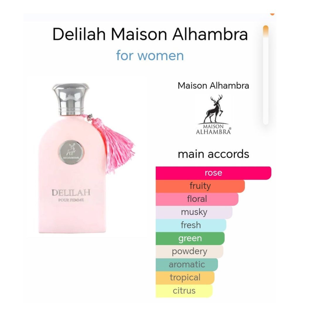 Delilah Pour Femme Eau De Parfum 100ml is an elegant and captivating fragrance that blends fresh citrus and fruity top notes with soft florals and a warm, sensual base. Designed for those who appreciate long-lasting and sophisticated scents, this perfume is perfect for daily wear, special occasions, or gifting. Its refined composition leaves a memorable and luxurious impression.
