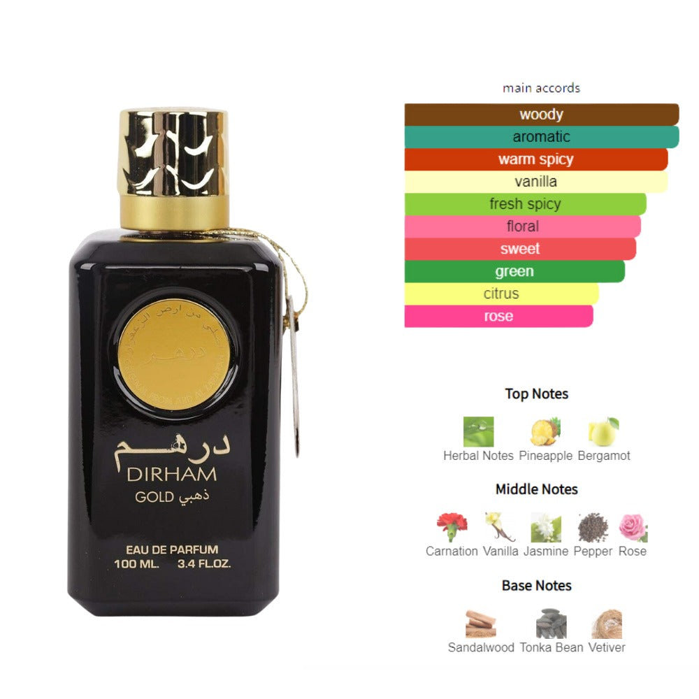 Dirham Oud opens with bright bergamot, fresh citrus, and a touch of sweet raspberry for an inviting start. The heart reveals elegant rose, smooth sandalwood, and aromatic lavender, adding balance and refinement. A warm base of white musk, amber, cedarwood, and rich oudh delivers depth and long-lasting appeal, creating a refined unisex oriental fragrance.